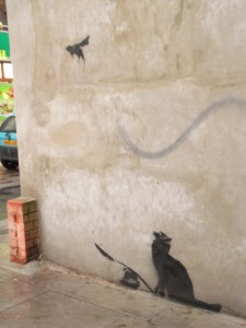 Skrev tidigare om fenomenet graffiti och om Ny Tids artikel Gråa väggen är en möjlighet, tänkte graffitimålaren. Städer är planerade till största delen av personer i maktposition vilket betyder att de inte är planerade av de flesta som bor där. Hur inspirerande är en grå vägg? Hur glad blir jag inte av ett graffiti konstverk som Cat, spoon and rat som jag ramlade över vid en street market i London. Jag blir jätte glad.