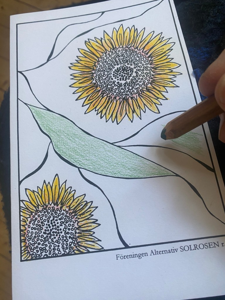 Jag tycker det är fint att måla eller färga solroskort som jag ger bort till folk som förlorat en när och kär, någon som fyller år eller någon som tagit en examen. Medan jag färgar tänker jag på personen jag minns eller vill fira.